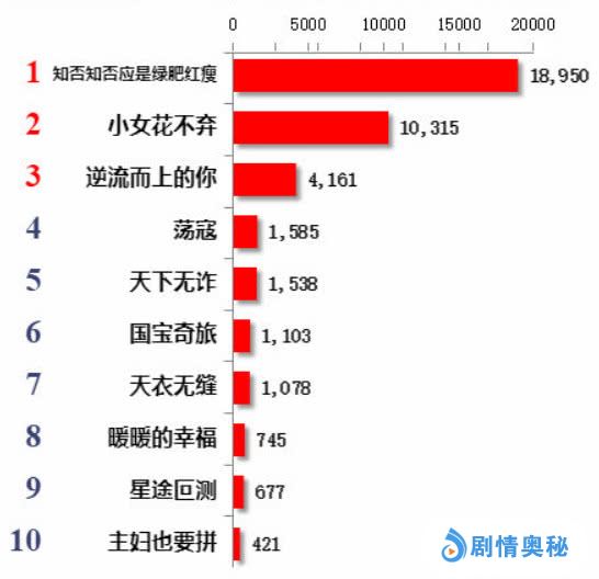 首先看到的是电视剧播放量排行榜,目前热度最高的三部电视剧依次是赵丽颖冯绍峰领衔主演的《知否知否》、张彬彬林依晨领衔主演的《小女花不弃》,以及潘粤明马丽领衔主演的《逆流而上的你》,其中已经收官的《知否》让人不舍,该剧依旧取得了单日18950万播放量的豪华数据,同样破亿的周播剧《小女花不弃》位居次席,虽然受到播出频率的限制,不过观众追剧的热情依旧居高不下,反倒是接档《知否》的《逆流而上的你》热度远不及前者。
