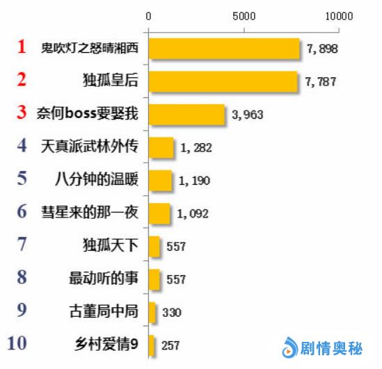 再看网剧播放量速递,目前热度最高的三部网剧依次是《鬼吹灯之怒晴湘西》、《独孤皇后》,以及《奈何boss要娶我》,其中排在第一名和第二名的两部网剧播放量不相上下,潘粤明高伟光扛起了《鬼吹灯之怒晴湘西》,陈乔恩陈晓扛起了《独孤皇后》,排在第三名的《奈何boss要娶我》略显掉队。