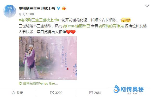 14日早上,《枕上书》的情人节福利就早早上线了,官博君送上了东华和凤九相拥的剧照,剧照里还有一句诗“花开花谢花化泥,长顺长安长相依”,这两行诗一眼就能看出秀恩爱了,满满的甜蜜。