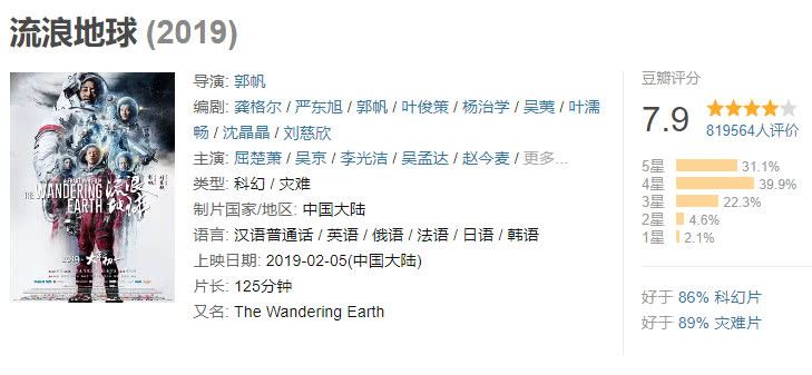 再看《流浪地球》的口碑,虽然该剧爆红后,口碑急转直下,不过截止小编发文时间,《流浪地球》还拥有7.9分的超高豆瓣评分,是2019年贺岁档口碑最高的贺岁片,该片超过了89%的灾难片,以及86%的科幻片,综合质量赢得了观众的肯定。
