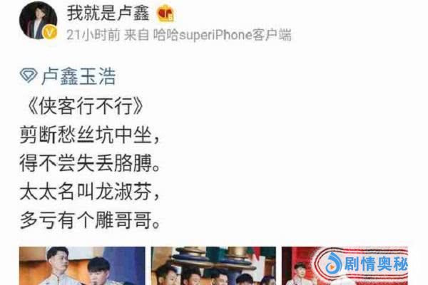 我们大家很快就等来了解释,从卢鑫发表的动态我们不难发现,他直接把矛头指向了节目组。他做的一首四句打油诗初看没什么,但细看很容易就能发现端倪,开头四个字连在一起,就是这一次节目令人失望的原因,“剪得太多”着实是尴尬啊。如果不去现场的话,大家伙就只能通过媒体观看,可这样一来,我们看到的就不是“原汁原味”了,很多地方都经过了剧组的剪辑,连续性肯定会受到干扰。