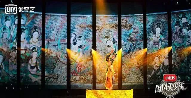 在舞美创新上,《国风美少年》的舞台也堪称一幅幅艺术品。为了给选手的表演助力添彩,可以看出节目组对每一个细节都是匠心打造。比如哈妮克孜表演敦煌舞时的舞台,哈妮克孜在圆柱形的小舞台上翩翩起舞,背后徐徐展开的是一幅壁画的投影,在灯光和背景的衬托下,让哈妮克孜的舞台宛如古代仙女飞天,将敦煌壁画如梦如幻的场景真实再现。