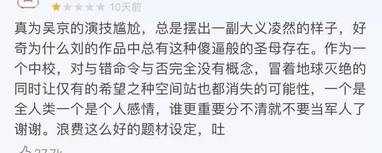 打开豆瓣下方的评论就会看到,打一星的理由要么是因为意识形态输出色彩过于强烈,要么是因为吴京。这两个因素成就了《流浪地球》,却也使《流浪地球》饱受诟病。