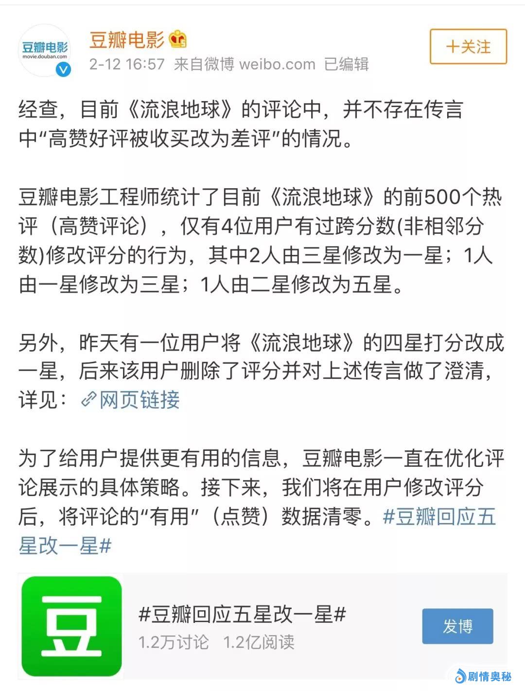2月12日,豆瓣一连发出三条相关声明,表示评分大幅修改属于非正常评分,不计入总分,也不存在传言中“高赞好评被收买改为差评”的情况。被举报的涉嫌收买用户、修改评分的账号为恶作剧,并且会“紧急优化产品功能”。早前,“豆瓣评分”事件就已经初具苗头,只不过这次《流浪地球》作为一个现象级影片,恰好在这个时间点引起了一场自下而上的爆发。