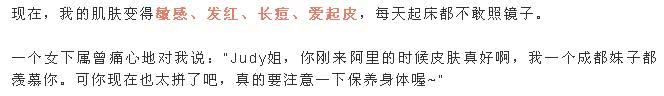 有一天她发现自己的皮肤越来越差,每天起床都不敢照镜子。王晗还称一个女下属曾痛心地对我说:“Judy姐,你刚来阿里的时候皮肤真好啊,我一个成都妹子都羡慕你。可你现在也太拼了吧,真的要注意一下保养身体喔~”说皮肤差是整篇文章重点,原因后续会说到。
