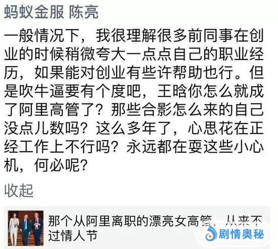 王晗这篇文章走红,是因为阿里巴巴蚂蚁金服高管陈亮在自己朋友圈转发了这篇文章“打假”,还有几位阿里巴巴员工同时“打假”,说王晗担任阿里巴巴高管是吹牛,耍心机,那些合影怎么来的,心里没数吗?