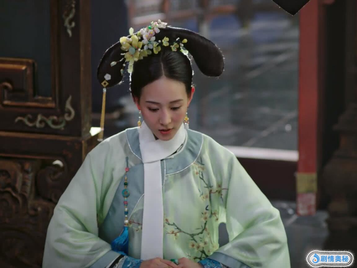 张钧甯的花朵裙,以浅浅的碧色为主,墨绿为辅,而后在中部侧边绣上了一枝、两枝的绿梅。据说她的闺蜜如懿最爱绿梅,所以海兰穿这件绿梅衫是不是携着对好友的情谊呢?