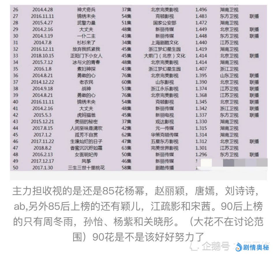另外,90后的女星如今也开始挑大梁出演大剧的女主角了,不过能够撑得起收视率的目前有周冬雨、杨紫、孙怡、关晓彤等。相比之下,85后的花旦可以说是很有号召力的,也是受到观众们认可的。
