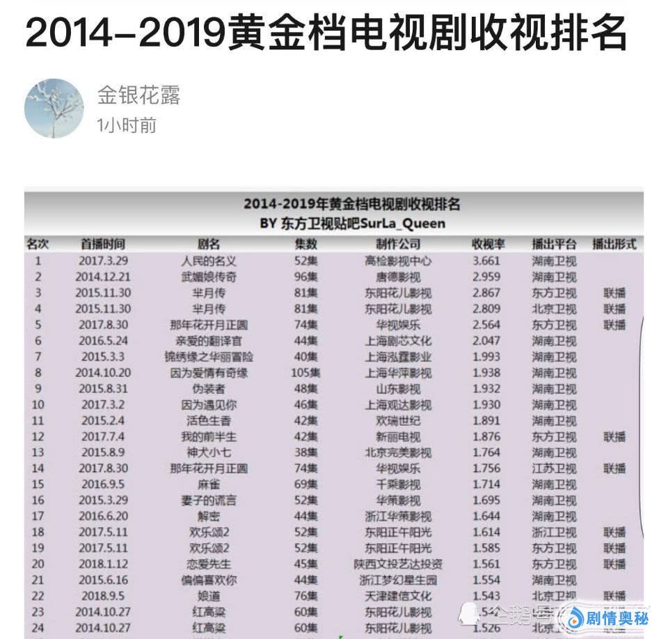 要说起如今的电视剧,相信很多观众们都是比较喜欢看的。而一部剧是否受到大众们喜欢,收视率就是最好的证明。近日,有网友总结了2014年至2019年黄金档电视剧的收视排名,可以说都是近些年热播的大剧。