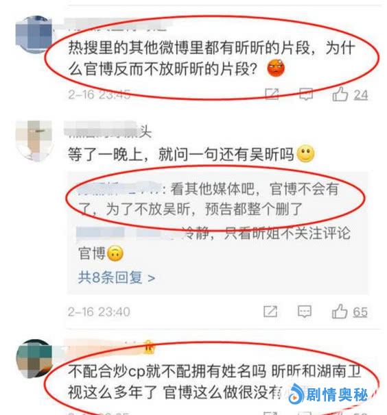 很多预告在微博上都能搜到,关于吴昕的也有。可是节目组官微只宣传了其余几人的戏份,却单独将吴昕的剪辑掉。此行为也让很多粉丝和路人觉着过分,直接跑到下面去吐槽。
