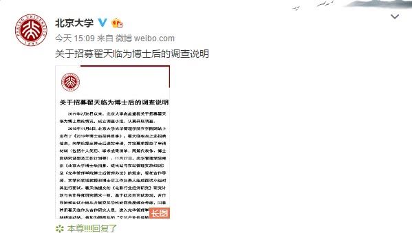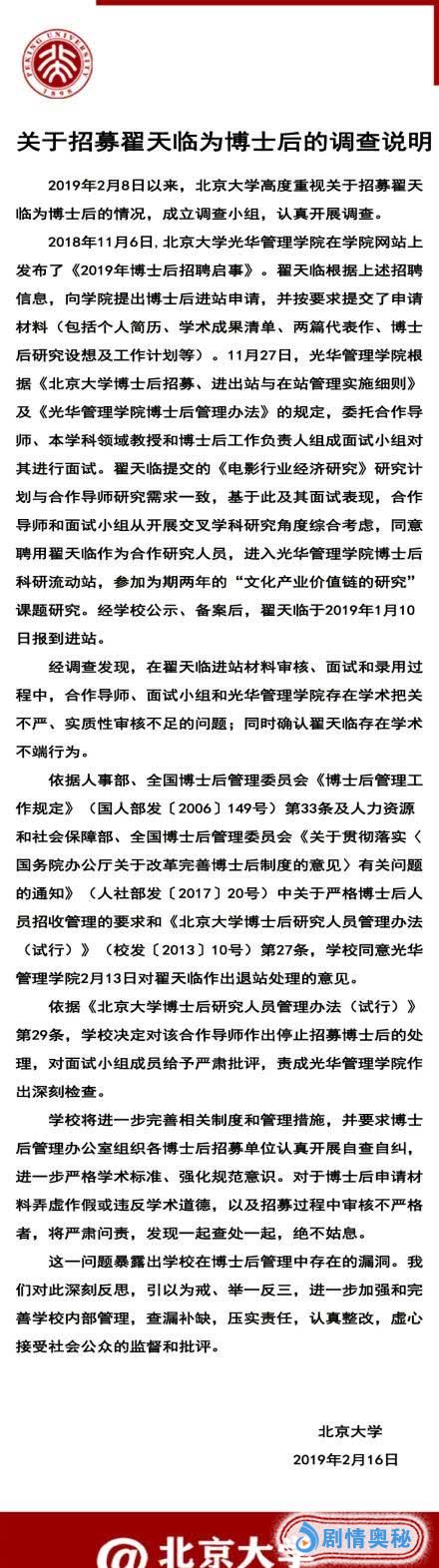 2月16日下午,北京大学发布关于招募翟天临为博士后的调查说明:经过调查发现,在翟天临进站材料审核、面试和录用过程中,合作导师、面试小组和光华管理学院存在学术把关不严、实质性审核不足的问题;同时确认翟天临存在学术不端行为。