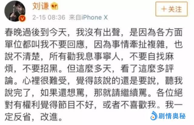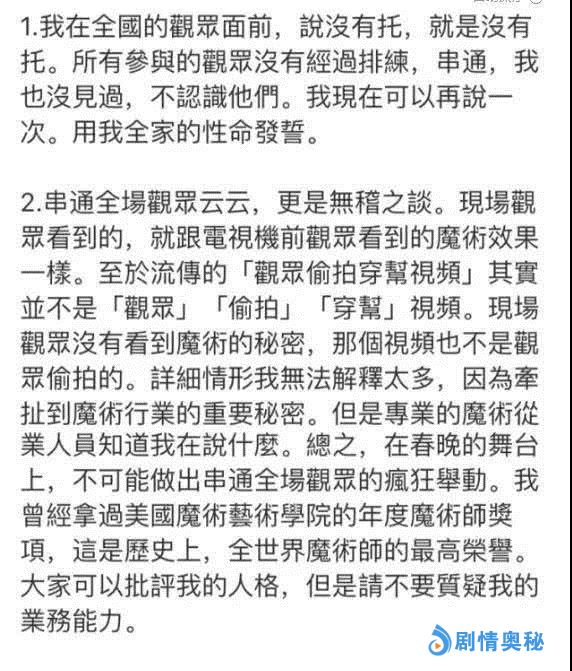 在事后,刘谦因为很多原因,没有在第一时间发声为自己辩解。但是在昨天,刘谦终于在微博中发了一篇小长文,对此事做了一个大概的解释。文中,刘谦对此事表示,那些说自己和全场观众串联的言论,纯属无稽之谈。而且,再次声明了,在魔术中没有托,保证现场观众看到的魔术效果和电视机前的观众看到的是一样的。