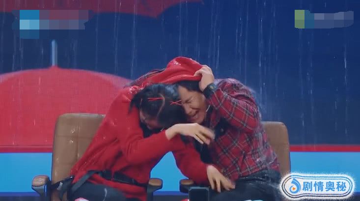 可是四个人都反应太慢抢不到雨具,雨具清一色摆在着桌子上。贾玲、华晨宇、关晓彤还有沈腾不得不接受淋雨惩罚。而华晨宇早就备好了一件夹克外套来挡雨贾玲和华晨宇安然无事,可是关晓彤和沈腾这边就遭罪了,关晓彤本想用自己的帽子遮雨的,可是旁边的沈腾却忍不住钻进关晓彤的帽子避雨这一幕实在太搞笑了,马丽、大张伟都被沈腾的举动给逗笑了。