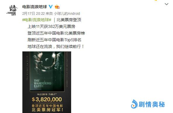 而昨晚《流浪地球》的官微宣布了《流浪地球》的北美地球上映11天获得了382万美元票房,登顶了近五年来中国电影北美票房榜冠军,也就是说《流浪地球》在北美票房已经反超了吴京的《战狼2》,虽然北美地区观看《流浪地球》都是亚洲人或者华人,但也有少部分的白人。外国影迷观看完了《流浪地球》都大赞对中国的特效刮目相看了,完全不输于好莱坞科幻大片的特效。