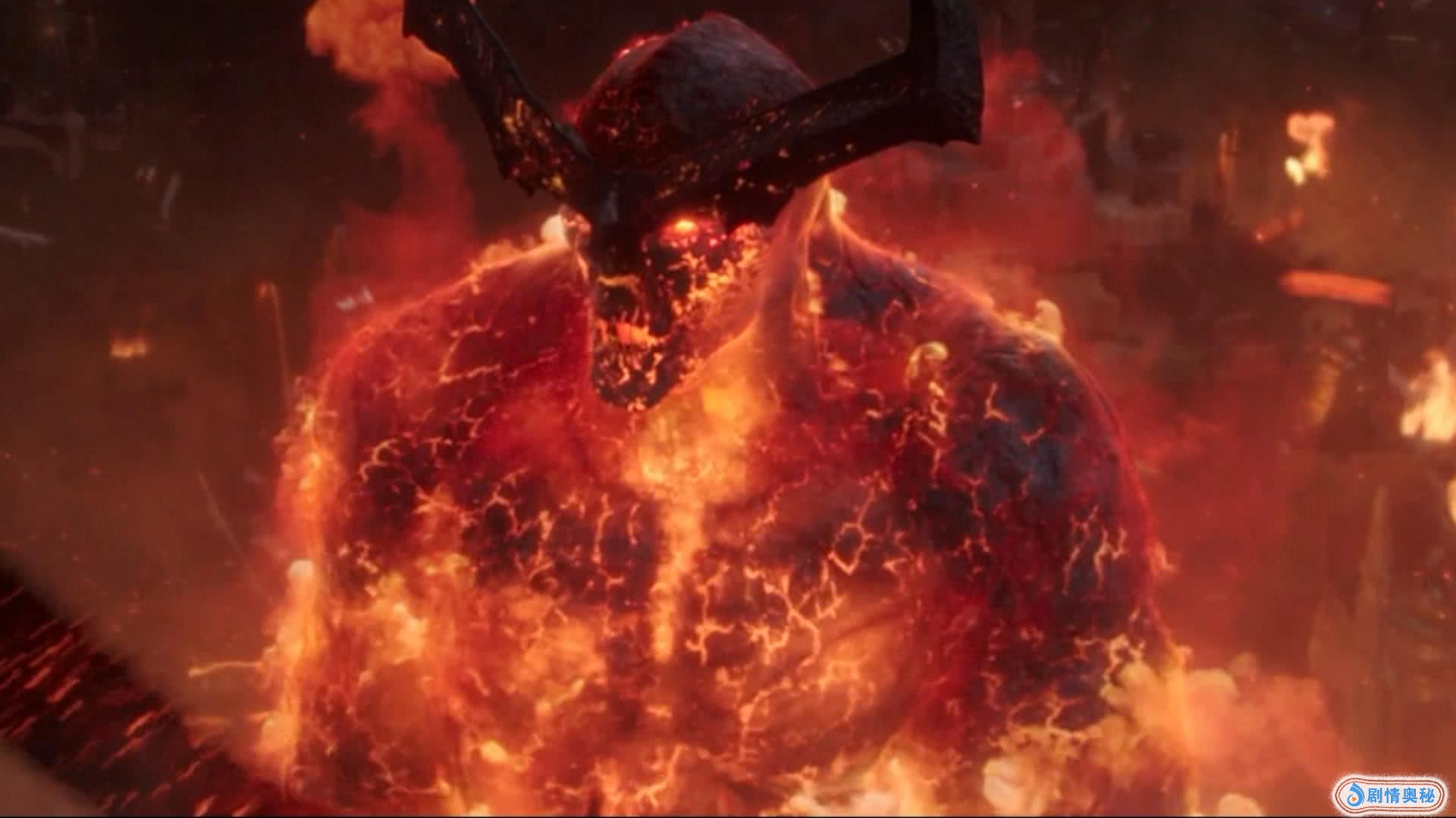 4.火焰巨人苏尔特尔!要说漫威电影宇宙中真正称得上超大块头的角色,火焰巨人当属是代表人物了!在《雷神3:诸神黄昏》中影片的结尾,诸神黄昏实现,火焰巨人苏醒,他就是阿斯加德的末日,体型壮如一座大山,整个阿斯加德在他挥舞着的巨剑下成为一片废墟!