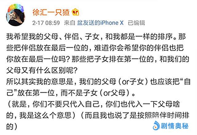 papi和焦俊艳是两个独立女性,她排的顺序也深受年轻人的认可,papi认为人首先爱的应该是自己,然后对于自己最重要的是伴侣,其次是孩子和父母,不得不承认papi的排序引我们深思,虽然独立女性会比非独立女性将自己提到了首要位置,但父母总是被我们抛之脑后,但在父母眼中孩子却是第一位的,作为年青一代的我们总是缺乏与父母的沟通,应该多关注一些父母的需求才对。