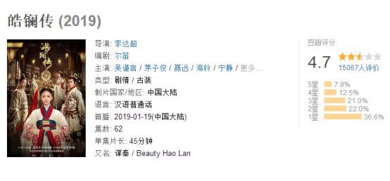 然而结果却是吴谨言被全网炮轰,《皓镧传》一时也成为众矢之的,一黑皆黑。《皓镧传》总共62集,如今已经播到56集临近大结局,剧情也全都打开了,高潮迭起。然而该剧的评分却持续走低,截止目前,《皓镧传》的豆瓣评分仅有4.7分,1星成功占据星级榜第一,高达36.6%,委实低迷。