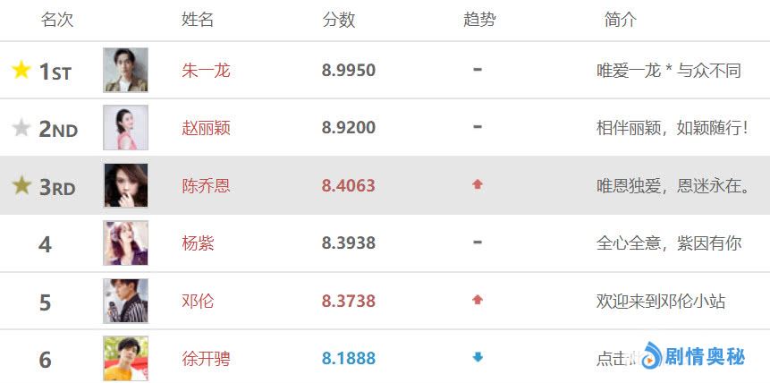 先看榜单前六名,目前热度最高的六位电视演员依次是朱一龙、赵丽颖、陈乔恩、杨紫、邓伦、徐开骋,其中正在拍摄新剧《盗墓笔记重启》的朱一龙稳居榜首,紧随其后的是安心养胎的赵丽颖,在热播剧《独孤皇后》中大秀演技的陈乔恩排名上升至第三,热度上升的还有与杨颖合作新剧《我的真朋友》的邓伦,主演《奈何boss要娶我》的徐开骋排第六,该剧已经完美收官。