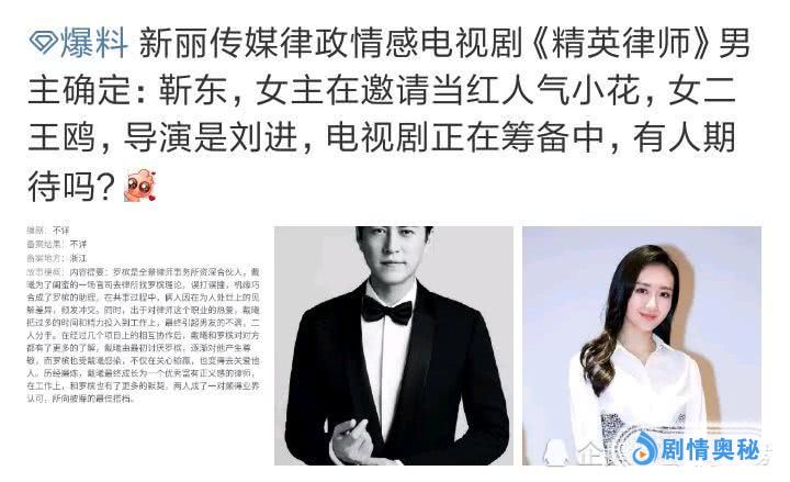 而据悉,近日有一部由新丽传媒打造的电视剧《精英律师》正在筹备当中,暂定在2019年上半年开机拍摄。这部剧是律政情感题材,男主邀请的是靳东出演。而合作的女主,据知情人士爆料邀请的是当红小花出演。