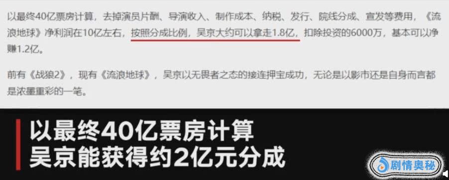 可是后面《流浪地球》的投资方有部分不看好作品临时撤资,吴京私人投入了6000万给剧组,剧组才有足够的经费制作世界级别的“特效”,而《流浪地球》也不让网友们失望,《流浪地球》或将在元宵节上票房突破40亿大关,而有媒体透露《流浪地球》随后票房后劲乏力不过最终票房预测在42~43亿之间,按照《流浪地球》40亿票房计算,那么吴京投资了6000万按照分成比例获利1.8亿,不过这只是40亿的票房,如果《流浪地球》票房破50亿大关,吴京将入账2个亿。