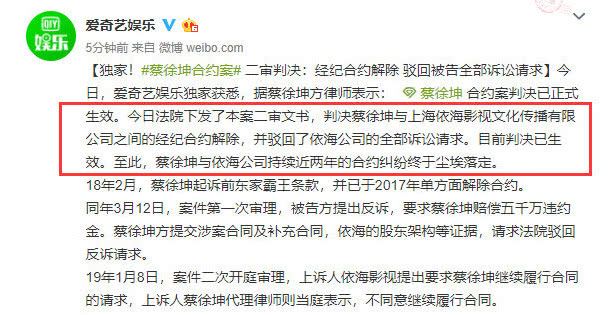 可是蔡徐坤还没火之前就一直被自己经纪公司压迫着,在参加《偶像练习生》之前蔡徐坤就已经与经纪公司打官司要解除合同。18年2月蔡徐坤起诉了东家,可是被东家反诉还要求赔偿五千万的违约金,不过蔡徐坤一直都在收集证据终于在第二审中,蔡徐坤成功胜诉法院驳回了经纪公司所有要求,并且经纪公司和蔡徐坤两人的经纪合同正式解约,蔡徐坤真真正正恢复了“自由身”。