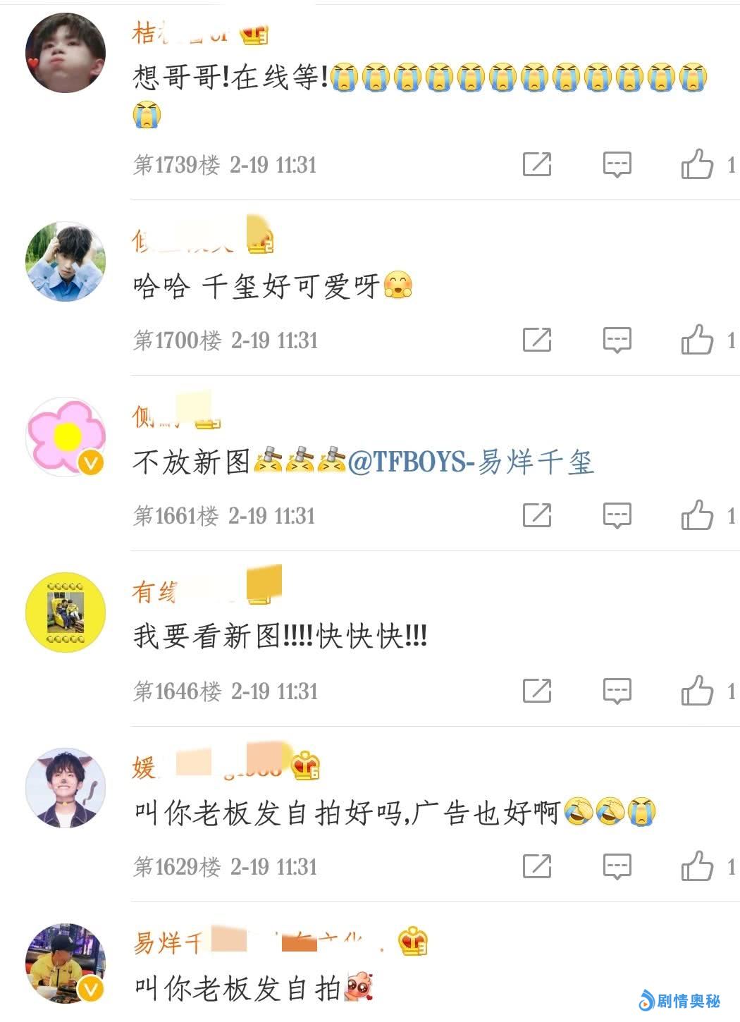 不过还是有一些粉丝喊话让工作室叫老板发自拍,今天元宵节要满足粉丝小小的愿望,并且还给工作室支招说反正千玺就在你旁边,你可以偷拍千玺,然后发出来送一个大福利给粉丝们,这个想法是非常不错的,但是工作室不听呀,哈哈哈哈,万一被老板扣工资或者开除了咋办呀。