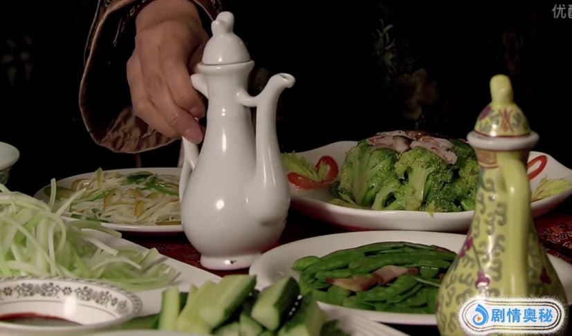 现在,明白我为什么说这桌菜大有讲究了吗?绿油油的西蓝花,绿油油的扁豆,绿油油的黄瓜,绿油油的葱丝,不正好寓意皇上也像这桌菜一样,变绿了吗?