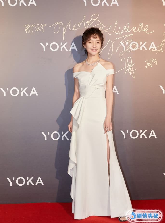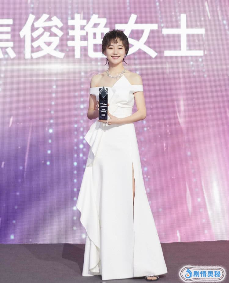 其实焦俊艳长得还挺高的,身高165cm的她,穿着这样的衣服很不错,她的裙子是高开叉的设计,秀出了超级纤细的美腿,而且她还很白,搭配淡妆,简简单单就美得不像话了,她的气质也真好啊。