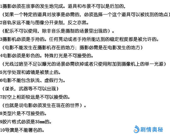 道格玛95宣言又称纯洁电影誓言,它要求电影拍摄要满足以下十条堪称严苛的戒律: