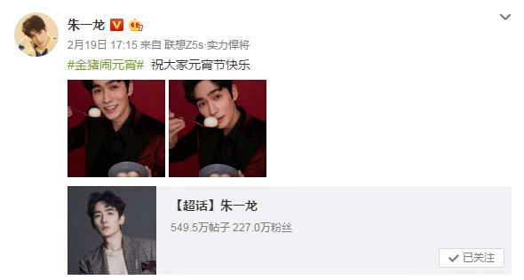 2月19日是一年一度的元宵节,相信大家都有和家人团聚吃汤圆吧。娱乐圈明星们也都营业给粉丝送来了元宵节的祝福呢,你们都有收到吗。作为娱乐圈的宠粉狂魔朱一龙,也是给粉丝送来了一个比较喜庆的福利了,首先是通过工作室送来了九宫格帅气照片福利。