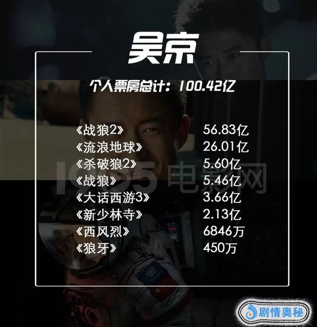 吴京就更不用说了,俨然已经成为首个累计票房破百亿的男主演,参演作品仅12部就创造了如此佳绩,确实很牛,光是一部《战狼2》就取得了56.8亿人民币的成绩,而正在热映的《流浪地球》还将助推这一数字继续攀升,不出意外,很长一段时间吴京将稳坐“票房最高明星”宝座。
