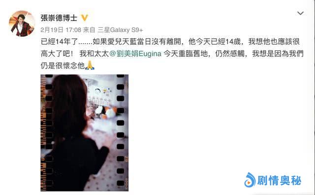 2005年长子离世之后,在2007年以及2008年刘美娟又先后生下了女儿与小儿子,如今一家四口生活幸福,只不过大儿子离世这件事一直是他们心中的痛,故此每年在张天蓝生忌这一天,刘美娟与张崇德都会去拜祭,更会在社交平台上发表心情感受,在今年的2月19日这儿一天,张崇德在社交平台上写道“已经14年了,如果爱儿天蓝当日没有离开,她今天已经14岁了,我想他也应该很高大了吧!我和太太刘美娟今天重临旧地,仍然感触,我想是因为我们仍是很怀念他。”,另外刘美娟也有在社交平台上悼念长子。