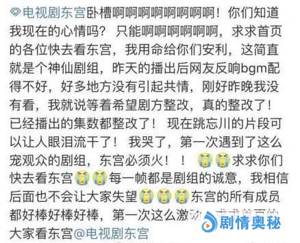然而大家即便清楚这是一部虐剧,却还是追到停不下来,《东宫》的热播也算是盛况空前。在追剧找虐的过程当中,粉丝们竟然还提出了“更虐”的要求。名场面之一的跳忘川情节,男女主一番绝情话之后跳下就已经足够虐心,粉丝们却希望加上BGM烘托出更虐的气氛……