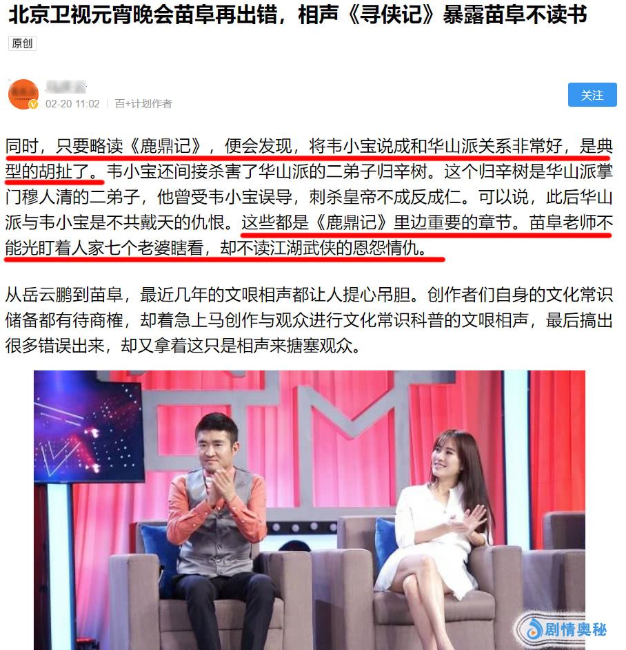 但是,过后也有网友提出异议,并发文称相声《寻侠记》人物关系搞错,暴露苗阜不读书。文中称,苗阜在相声中说《鹿鼎记》里的韦小宝与华山派关系很好,纯属胡扯,为此作者还特意拿出金庸原著《碧血剑》和《鹿鼎记》进行分析,最后觉得苗阜的相声作品不够严谨。