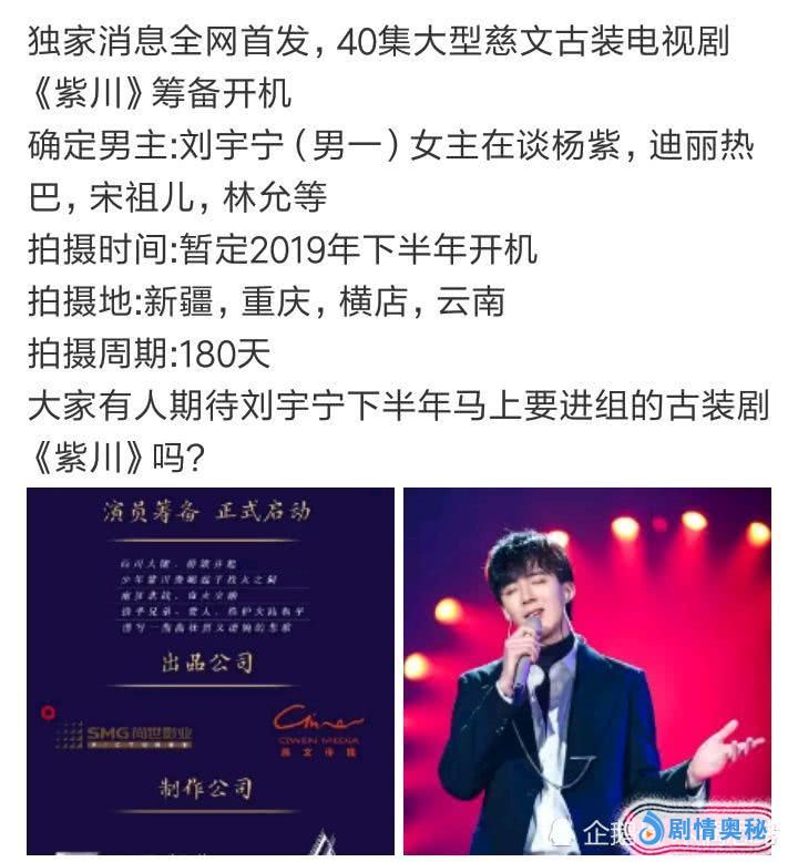 这部剧刘宇宁出演男二号,也是有不少戏份的。而据知情人士爆料,目前由慈文传媒担任出品的大型古装剧《紫川》正在筹备当中,暂定在2019年下半年开机,拍摄取景地为新疆、重庆、云南、横店,总共是40集的戏份。
