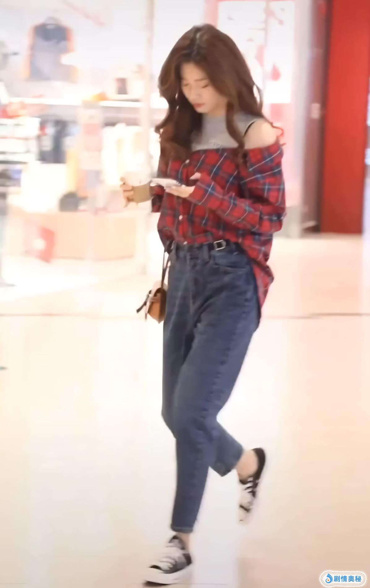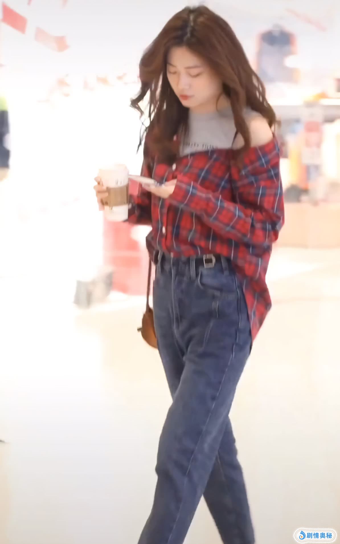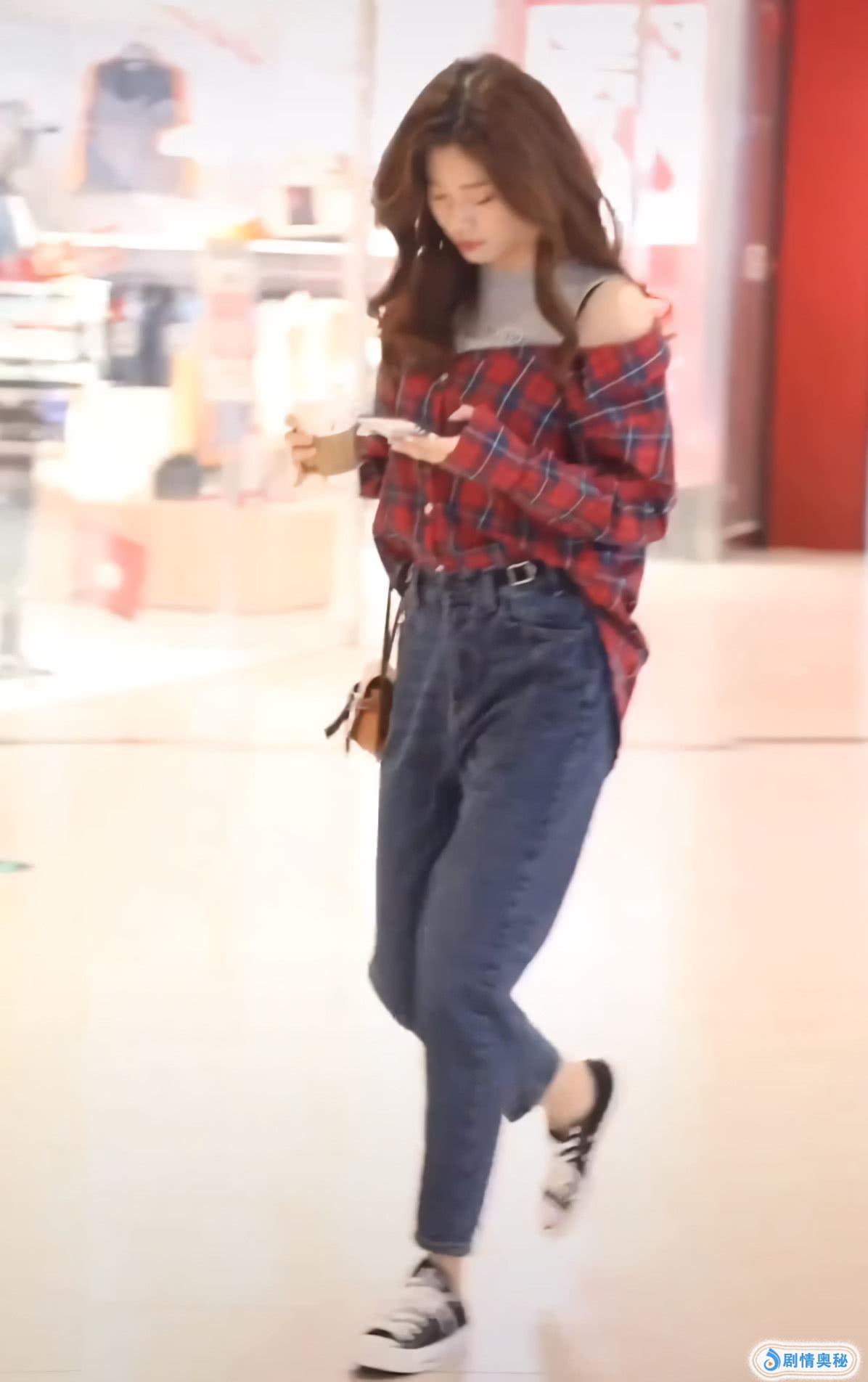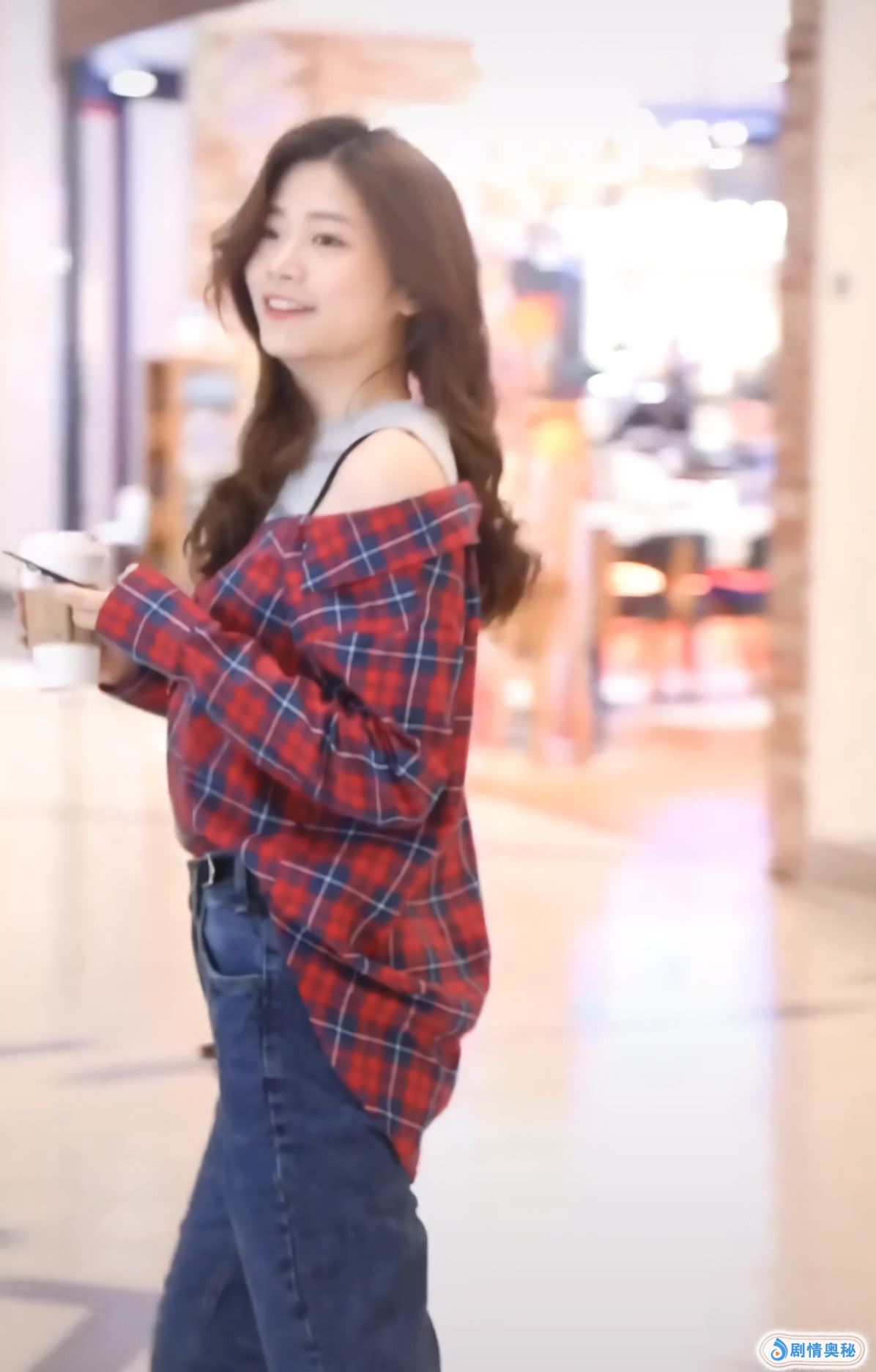 小姐姐穿了一件红色的格子衬衫,是比较宽松的衬衫,看着就很不错,她在里面穿了一件灰色的背心,看着也很不错,这件背心搭配红色的格子衬衫,十分合适,还有点露肩的设计,看着有点小性感。