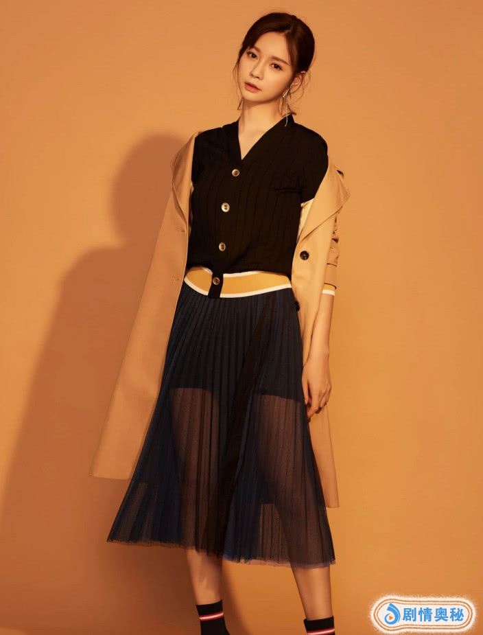 沈梦辰她的打扮是很好看的,穿着一件卡其色的风衣,非常简单的衣服,还有点修身,实在是太不错了,搭配了一条黑色纱网裙子,又显得很时尚了,搭配了一件黑色针织衫,看着她的身材真好啊。