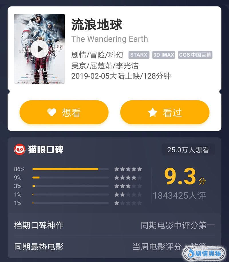 《流浪地球》的口碑非常好,特别在经历了豆瓣网友修改评分风波之后,该片的豆瓣分稳定在了7.9分,参评人数接近了100万。而猫眼口碑更是给出了9.3的高分,参评人数超过了180万,5星占比达到了86%,在同期电影评分中排名第一,可以说全网好评如潮。