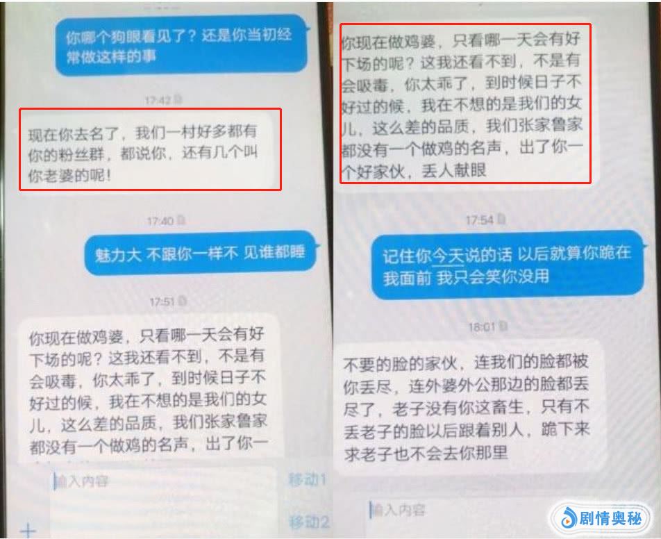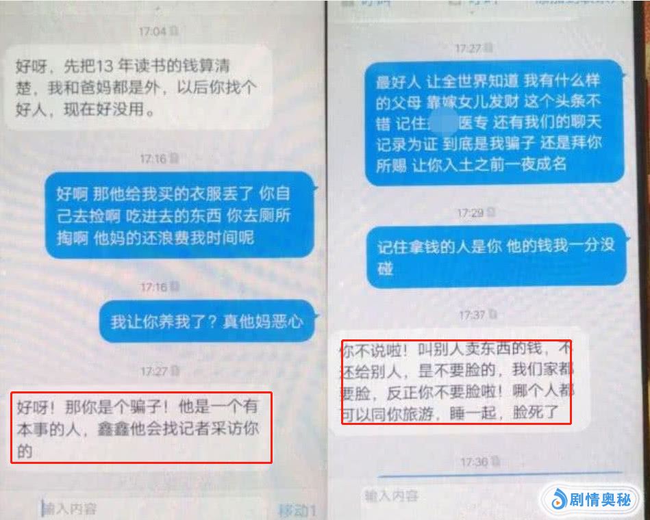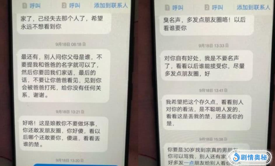 其父母见逼婚不成,就转战她的同学朋友,发了大量极其侮辱的淫秽词语,实在是让人难以相信,这些话居然是一对父母骂自己的女儿的。