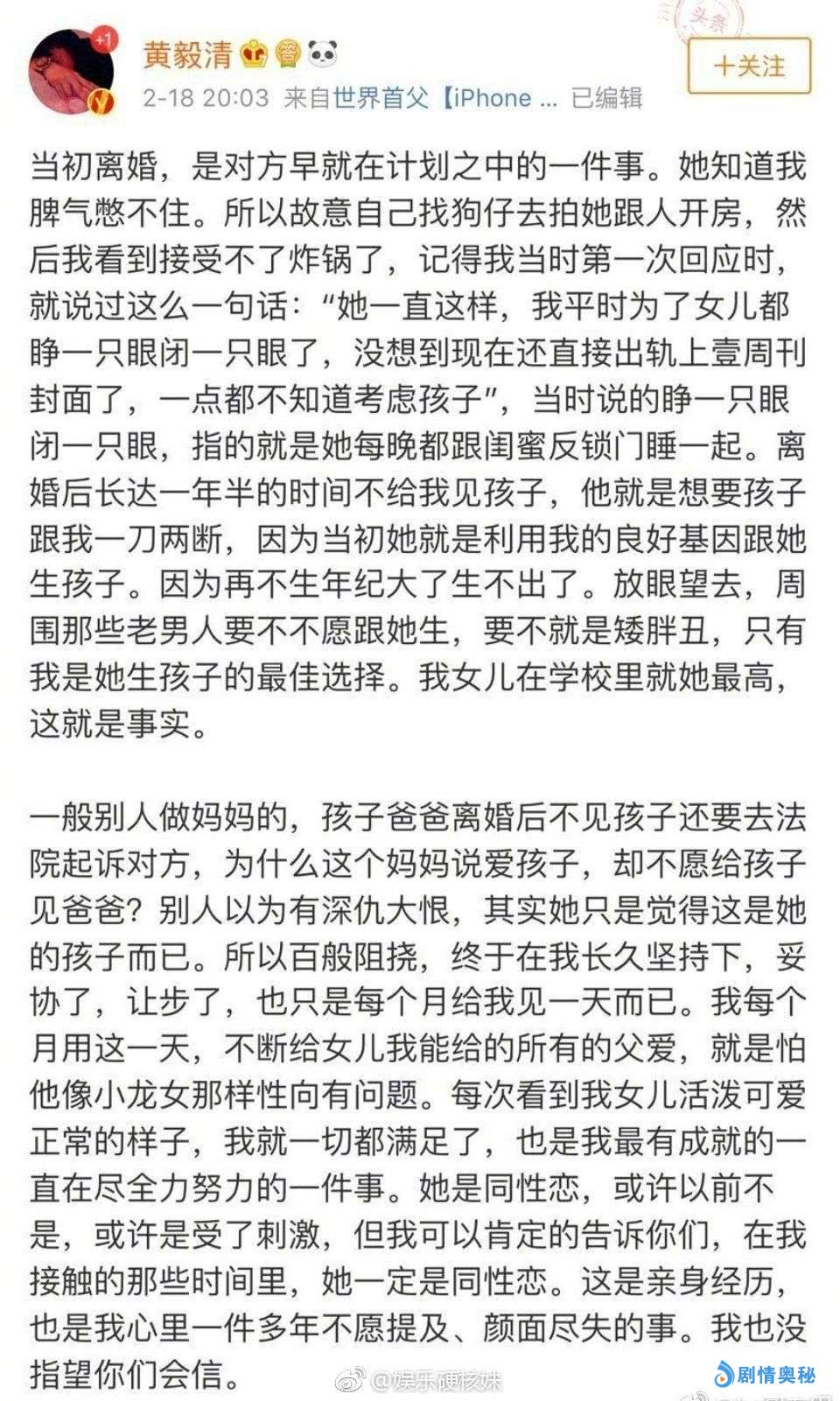 如今,黄毅清一天之内,更新多条微博,指责黄奕,没有尽到做母亲的责任,甚至暴露黄奕的私生活。说原因因为第一任丈夫的原因,改变了性取向,并且公开了自己和黄奕婚后的生活。为了孩子,他对黄奕的事情,睁一只眼闭一只眼。