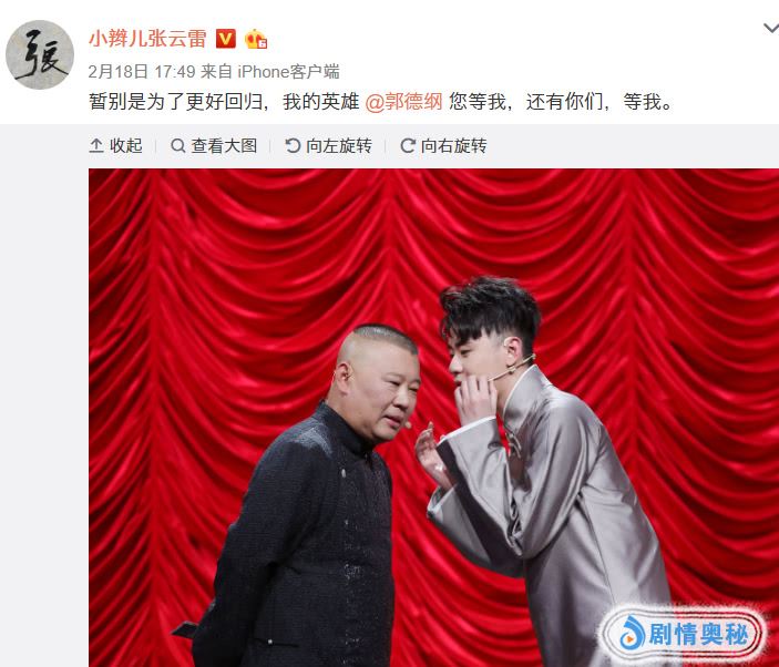 我在两天前写过文章,对张云雷的退赛进行了分析,称这是一件好事,无论是对于《欢乐喜剧人》、德云社以及张云雷本人,都是一个很好的选择。况且张云雷也表示,暂别是为了更好回归,请师父郭德纲和喜爱自己的观众们耐心等待。