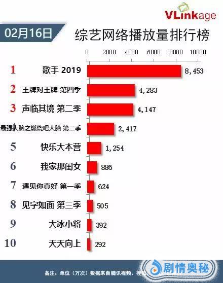 不过,虽然收视率较往年有所下降,但节目的网络播放量还是相当可观。据vlinkage数据显示,在2月16日当日#综艺播放排行榜#中,由芒果TV独播的《歌手2019》以8,452万的日播放登顶。