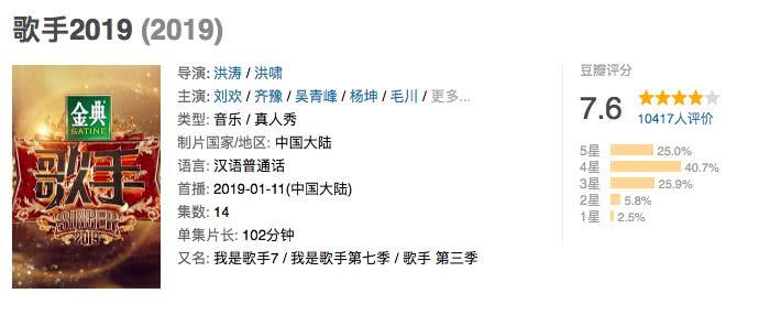 与此同时,就口碑来说,豆瓣网友们也给《歌手2019》打出了7.6的高分,比《歌手2018》的6.6分高出了整整1分。如此看来,今年节目赛制的调整、舞台的音效、选手的表现在某种程度上还是得到了一部分观众的认可。