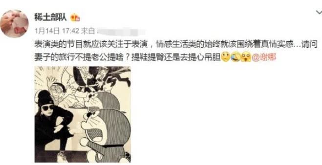 但是从现在节目中开播之后的反应中还是能看出,谢娜最后还是考虑了网友的建议,在节目中对张杰只字不提,但是想想也是有点奇怪的,为什么在情感综艺里面妻子不能在旅行中提到自己的丈夫呢?