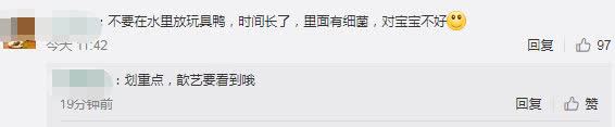 对此,很快有网友也在留言区提醒她表示:“不要在水里放玩具鸭,时间长了,里面有细菌,对宝宝不好”,当然,为了让新手妈妈张歆艺看到,很多网友也是齐力点赞把这条评论顶到热门评论位置,可以说是十分暖心了。