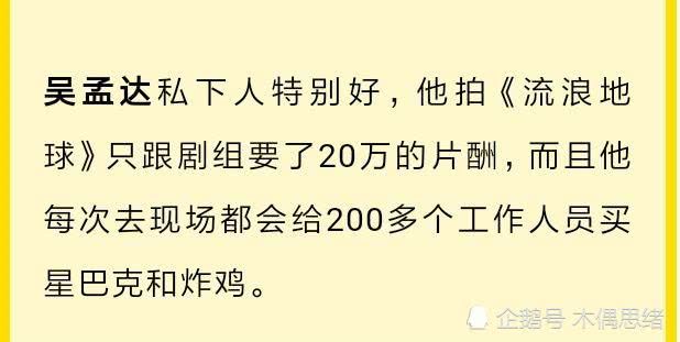 不仅如此,据悉吴孟达拍完这部《流浪地球》,拿的片酬只有20万。而吴孟达每次去到现场,都会给200多个工作人员买星巴克和炸鸡,可以说是非常的暖心了。而对于《流浪地球》的高票房成绩,吴孟达表示:值了。