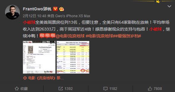 到了12号《流浪地球》已经位列全美首周票房第13位,划重点【全美只有64家影院放映】,这么少的播放影院,却创造出如此高的票房,就问大家“骄傲不?”