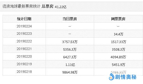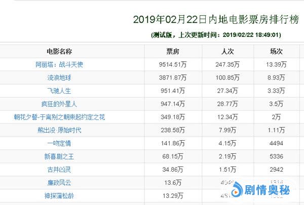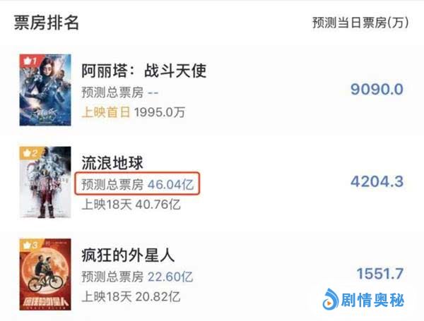 目前《流浪地球》的总票房已经超过41亿,距离《战狼2》还差15亿,但最近几天《流浪地球》的票房明显后劲不足,在连续14天霸占票房榜首后丢掉了单日票房冠军,今天的票房冠军是来自北美的科幻动作片《阿丽塔:战斗天使》,这部影片的上映大大冲击了《流浪地球》的票房量。