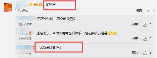 当然,为了避免争议扩大,不想因粉丝言论影响两位爱豆之间关系的粉丝也评论:“拒绝比较,当然大幂幂也很棒啦,抱走徐娇小姐姐。”“不要比较了,两个都很漂亮。”
