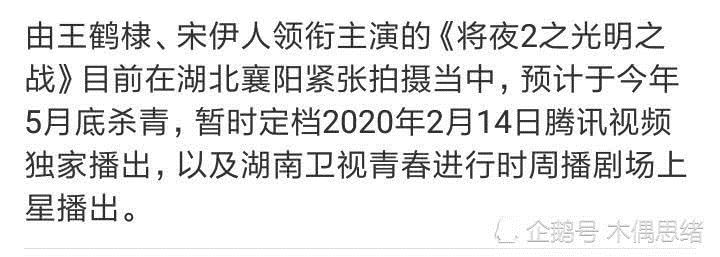 目前,这部剧的第二部《将夜2》已经在紧锣密鼓拍摄中了,据悉剧组已经转移到湖北襄阳取景地进行拍摄。这部剧预计在今年的5月份杀青,而播出的时间定档在2020年2月14日,播出平台是湖南卫视周播剧场以及腾讯视频。